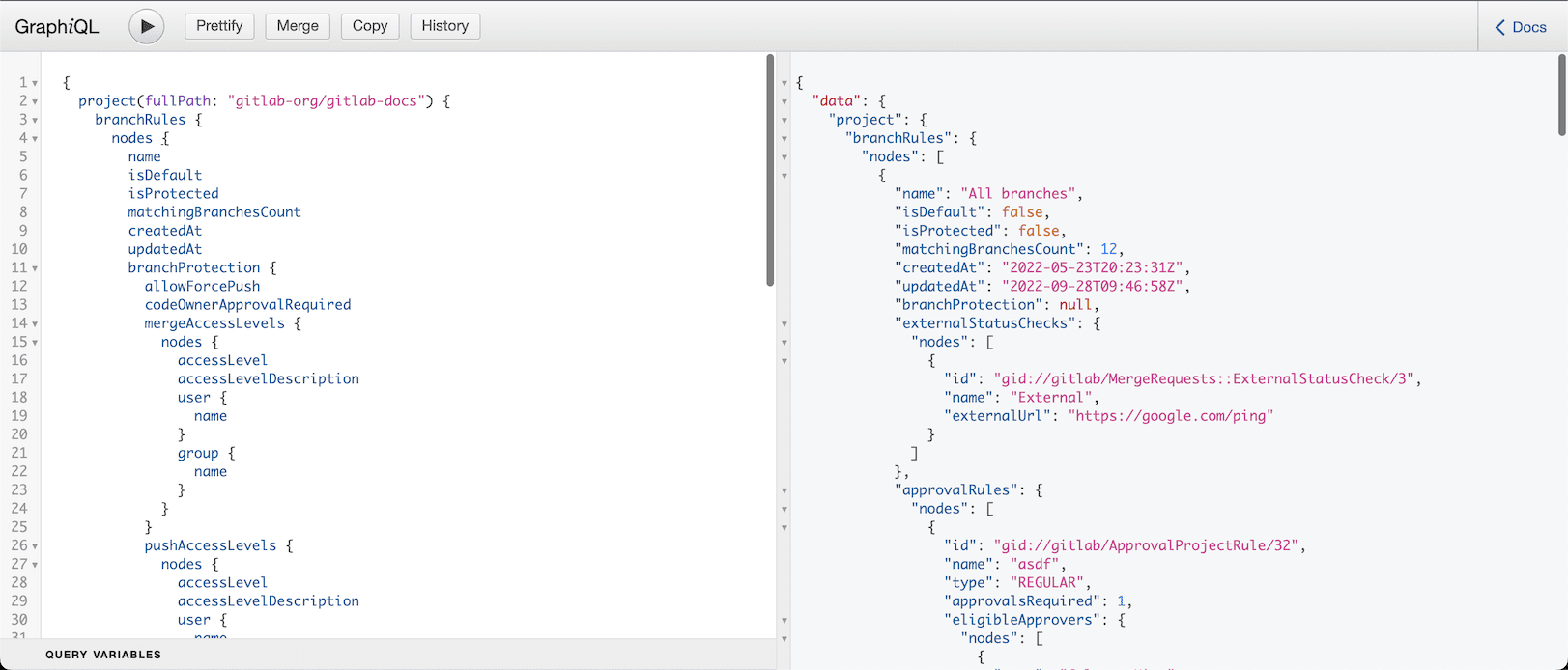 このクエリの例では、GitLabインスタンス内のプロジェクトをフルパス(例えばgitlab-org/gitlab-docs)で探します。クエリでは、プロジェクトに設定されているすべてのブランチルールを要求します。