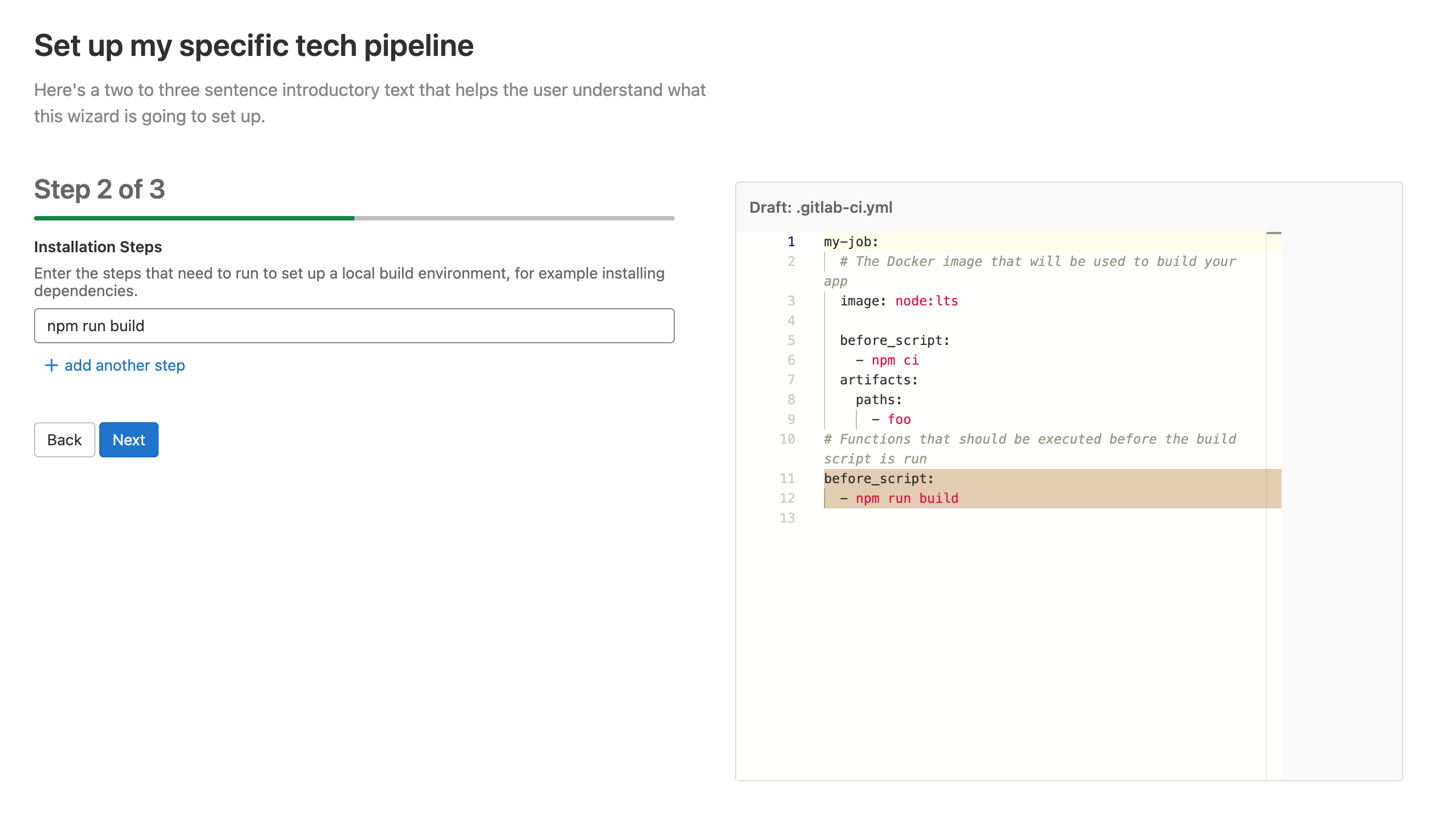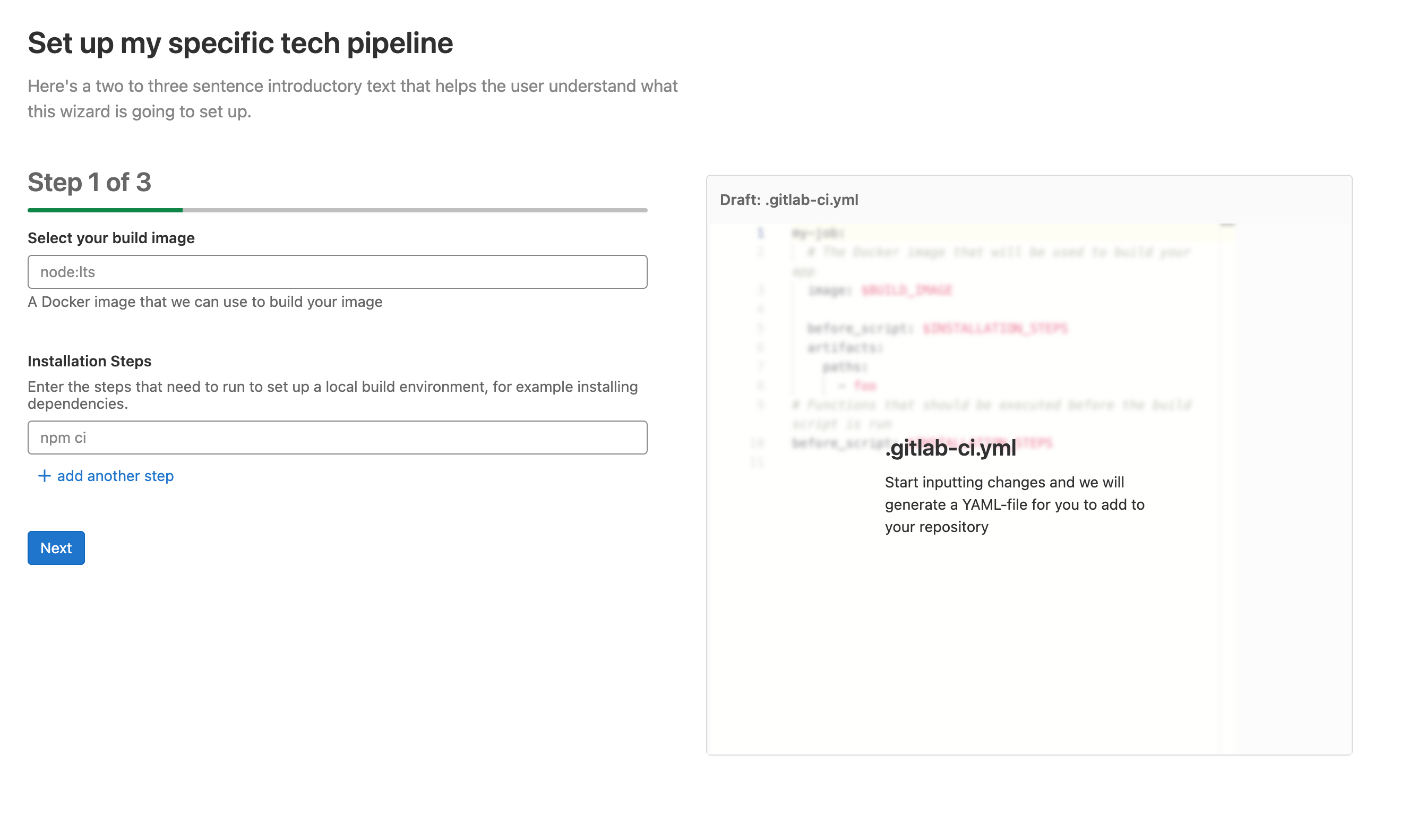 ステップは、マルチステップ(またはページ)プロセスの1ページを構成します。最終的な.gitlab-ci.yml の一部を構成する、1 つ以上の関連する入力フィールドで構成されます。