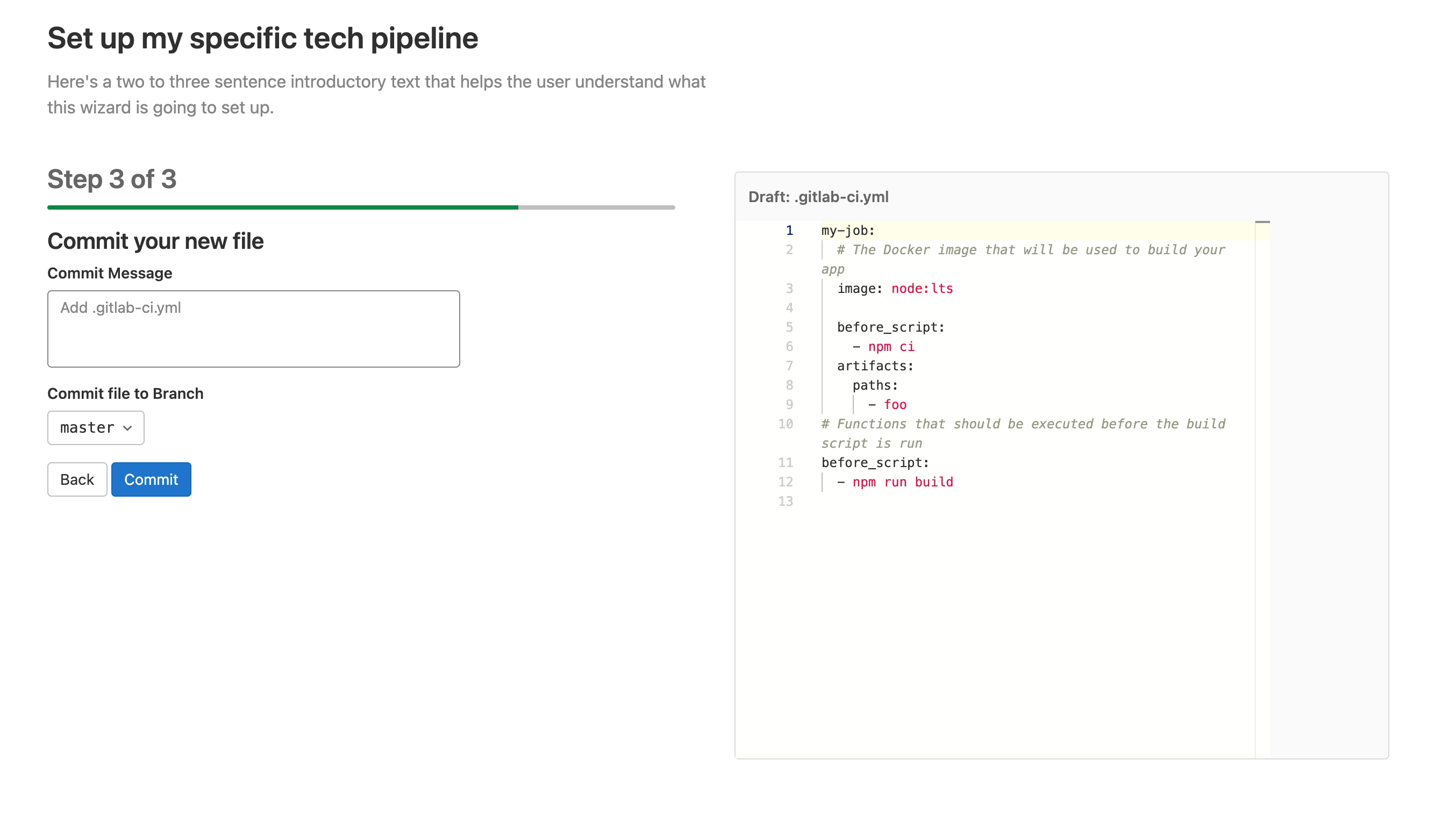 パイプラインウィザードは、ユーザーフローを設定する単一のテンプレートファイルを想定しています。ウィザードはファイルの内容を問わないので、ウィザードを使用してさまざまなフローを表示できます。例えば、静的サイト用のテンプレートファイル、Dockerイメージ用のテンプレートファイル、モバイルアプリ用のテンプレートファイルなどです。第一段階として、これらのテンプレートはGitLabのソースコードの一部です。