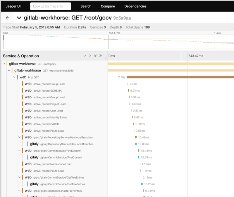 分散トレースは、GitLabアプリケーションの異なるコンポーネントを通過するリクエストのライフサイクルを理解するのに特に役立ちます。現在のところ、Workhorse、Rails、Sidekiq、Gitalyがトレース・インストゥルメンテーションをサポートしています。