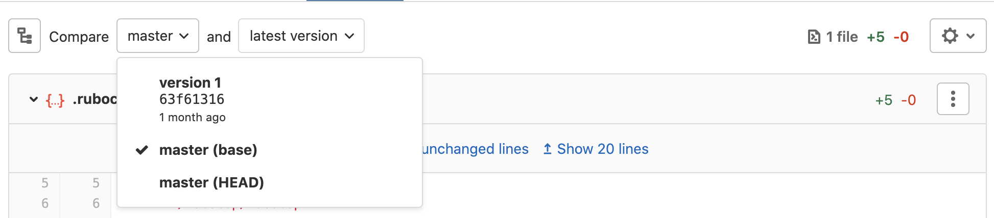 diff にマージ参照を使用する」と「diff で競合をマージする」というエピックが完成するまでは、main (base) とmain (HEAD) の両方のオプションがマージリクエストで表示可能です: