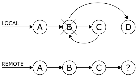 B にリセットしてE をコミットすることです。しかし、この方法ではA-B-Eになってしまい、他の開発者が内部で持っているものと衝突してしまいます。ステージされたローカルの変更を履歴変更で元に戻す