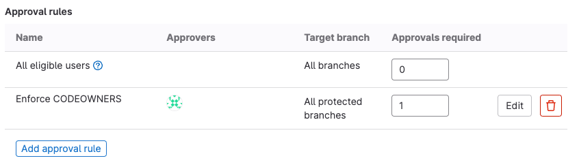 - マージリクエスト承認者セクションで、承認ルールまでスクロールします。