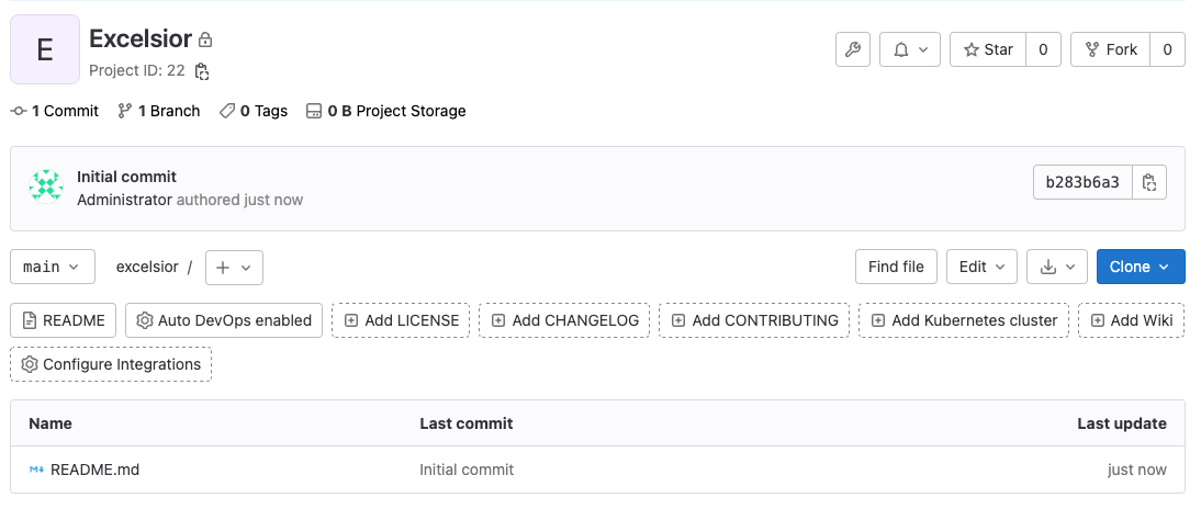 GitLab がexcelsior プロジェクトを作成し、そのホームページにリダイレクトします。このようになります: