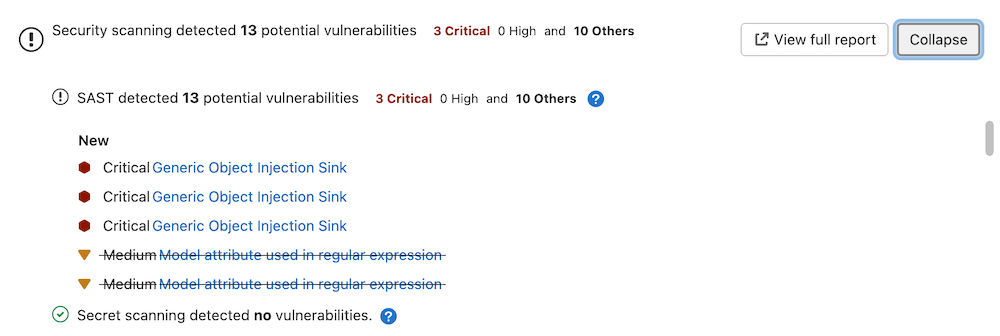 脆弱性に関する統計や詳細はマージリクエストに含まれます。変更がマージされる_前に_アクション可能な情報を提供することで、先手を打つことができます。
