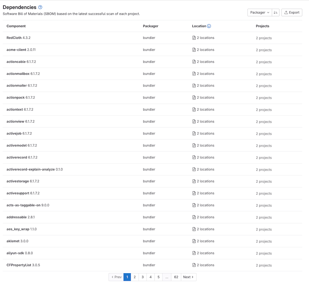 Exporterボタンを選択すると、グループやプロジェクトの依存関係リストとその詳細を JSON 形式でダウンロードできます。依存関係リストには、デフォルトブランチで最後に実行されたパイプラインの結果のみが表示されます。