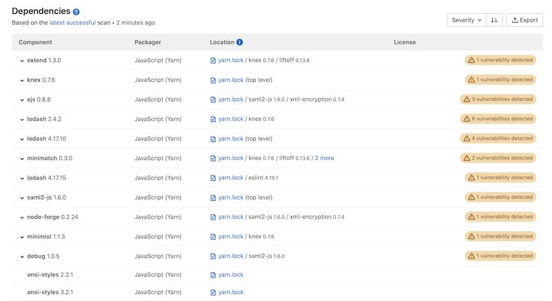 依存関係リストを使うと、プロジェクトやグループの依存関係や、既知の脆弱性を含む依存関係の主要な詳細をレビューできます。これは、既存および新規の発見を含む、プロジェクト内の依存関係のコレクションです。