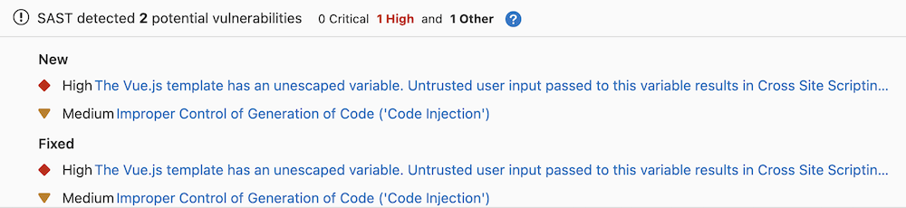 GitLab SASTは高度な脆弱性追跡アルゴリズムを用いて、リファクタリングや関連性のない変更によって同じ脆弱性がファイル内で移動した場合、より正確に特定します。