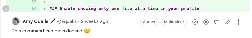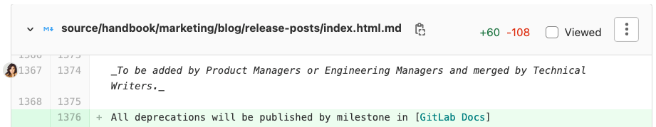 変更点の多いファイルは、パフォーマンスを向上させるために折りたたまれます。GitLab はメッセージを表示します:一部の変更は表示されません。そのファイルの変更点を表示するには、Expand file を選択してください。
