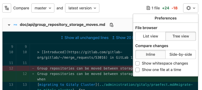 マージリクエストの変更の長さによっては、変更をインラインで、あるいは並べて表示する方が簡単な場合があります: