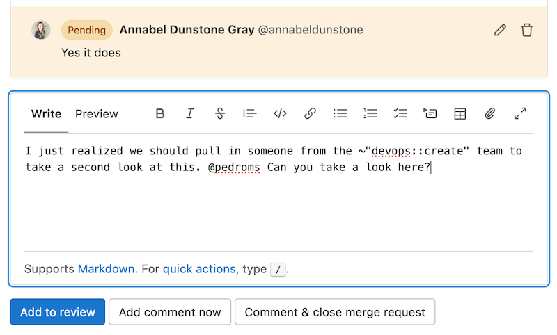 - レビューが完了したら、レビューを投稿できます。コメントが表示され、コメントに含まれるクイックアクションが実行されます。